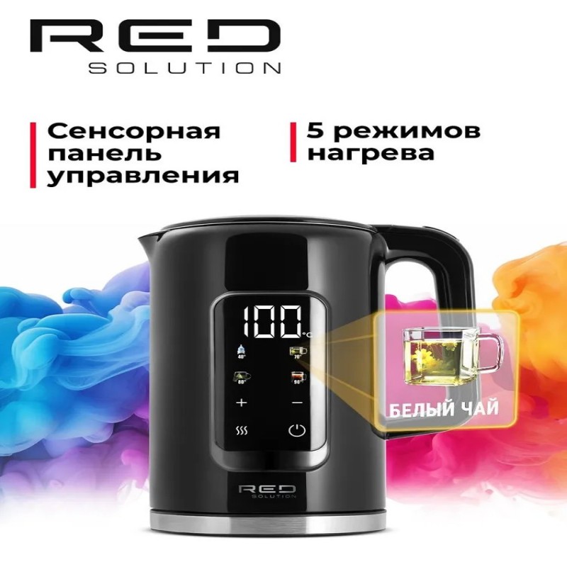 RED solution AM120D Colorsense (*Колорсенс)— электрический чайник объемом 1,7 л и мощностью 2000 Вт с большим светодиодным дисплеем, на котором отображаются режимы нагрева и температура воды. Благодаря двойной стенке вода в чайнике остывает медленнее, а корпус не нагревается, даже когда вода кипит. Эта модель станет прекрасным подарком и стильным украшением кухни.