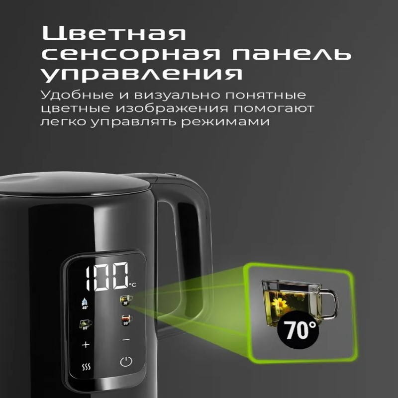 Данная модель выделяется на фоне остальных ярким цветным светодиодным дисплеем. На нем крупно отображаются текущая температура воды и пять режимов нагрева: кипячение, режимы для разных видов чая и кофе, детского питания и подогрев.